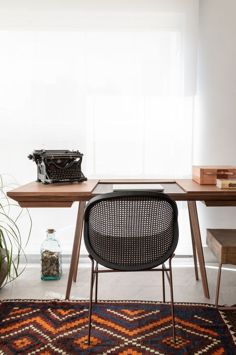 No home office, a tapeçaria de inspiração étnica e a presença de uma máquina de escrever vintage conectam passado e presente com leveza. Já no dormitório, texturas macias, luz natural e elementos artesanais transformam o espaço num convite ao descanso e à contemplação.