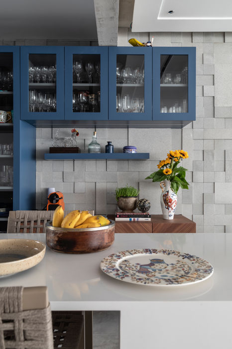 Nos banheiros, o uso de pedras e revestimentos geométricos revela a preocupação com a materialidade e a durabilidade, sempre com soluções práticas e elegantes. O projeto é, em essência, uma extensão do estilo de vida dos moradores — funcional, afetivo e visualmente harmonioso.