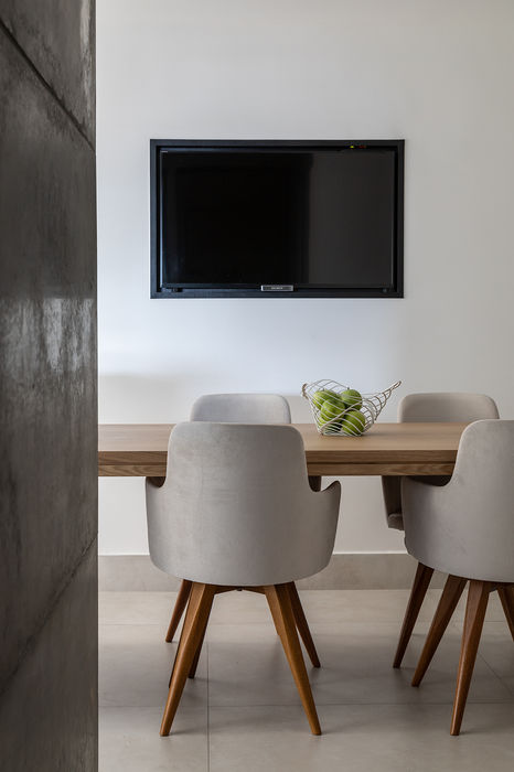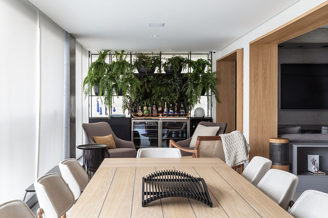 A sala de jantar ganha protagonismo com sua mesa clara, cercada por cadeiras de linhas leves e estofado neutro, convidando a longas refeições em boa companhia. Ao fundo, o bar com jardim vertical transforma o espaço num verdadeiro oásis urbano — um respiro verde que conecta natureza e arquitetura com sutileza.