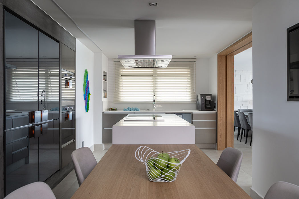 Já a cozinha, integrada e bem iluminada, aposta na funcionalidade e em superfícies limpas, com marcenaria sob medida e tons suaves. O resultado é um lar que traduz o conforto sofisticado com naturalidade e intencionalidade, onde cada elemento dialoga com o próximo, compondo uma narrativa de bem-estar e beleza atemporal.